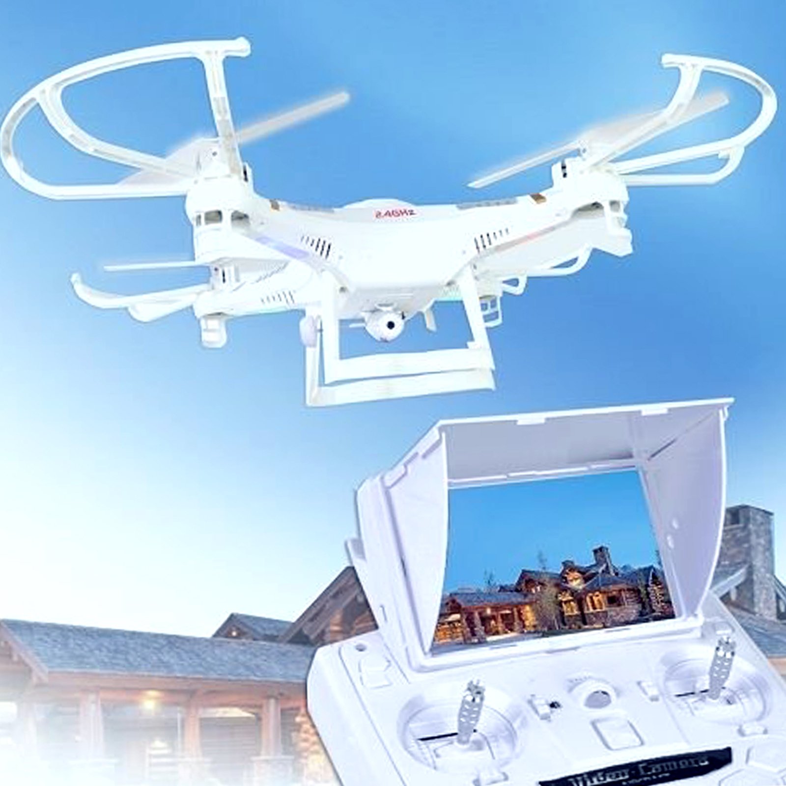 A white drone with four propellers is flying in the sky above a white remote control with a screen displaying a house. The drone is positioned to the left of the remote control, and both are set against a clear blue sky. | X118FPV 5.8ghz Real Time Video Transmission Quadcopter Camera Drone | f13a46f6990254879ca7b2b27d58501abf544aa2117c14ba921ec207e85d4c63 | 000910723082 | 0 | 0 | 42 | 9 | 0 | 0 | |