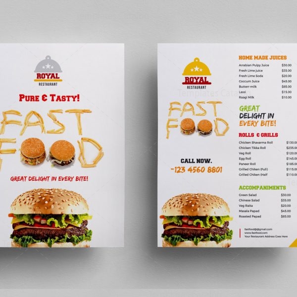 The first image displays a menu for a fast-food restaurant called 'Royal Pure & Tasty Fast Food'. The menu features a large, stylized image of a burger in the center, with the words 'Pure & Tasty Fast Food' written above it. The menu items are listed in a playful, cursive font with prices and descriptions. The top sect... | Food Menu Flyer Template Template Catalog | e0f757025c4ee3cc56fb575c6dd484d63e6a046c0533384121d8688857e43997 | 000910723033 | 0 | 0 | 99 | 6 | 0 | 0 | |