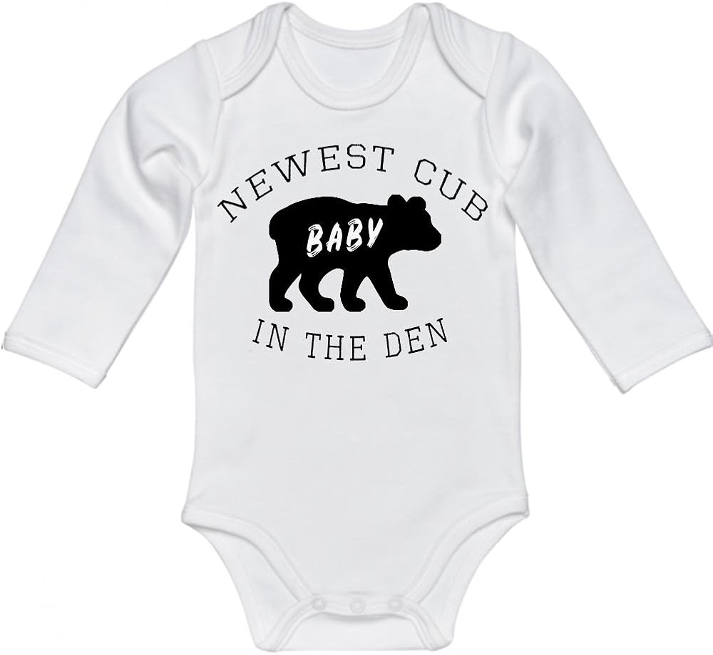 A white onesie with a black bear graphic and the text 'NEWEST CUB IN THE DEN' is displayed. | Black and Camo Baby Bear BodysuitBodysuit Cute Baby Gift | 4a9d2f385c2dfa273ce076c0aced29b73b2f3b4dc8aead56cc11b4736c65e7c7 | 000910723221 | 0 | 0 | 18 | 9 | 0 | 0 | |