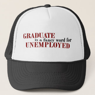 A black and white baseball cap with the phrase 'GRADUATE IS A FANCY WORD FOR UNEMPLOYED' written in red and black text. The cap has a black brim and a white top with a black bill. The text is centered on the cap, with the word 'GRADUATE' in red and the rest of the text in black. | Graduate Fancy For Unemployed Trucker Hat | 080b173941291e1c404d4cffcf4d7a5d442af6dbf710c751a883d4025ee3a83a | 000910723283 | 0 | 0 | 57 | 6 | 0 | 0 | |