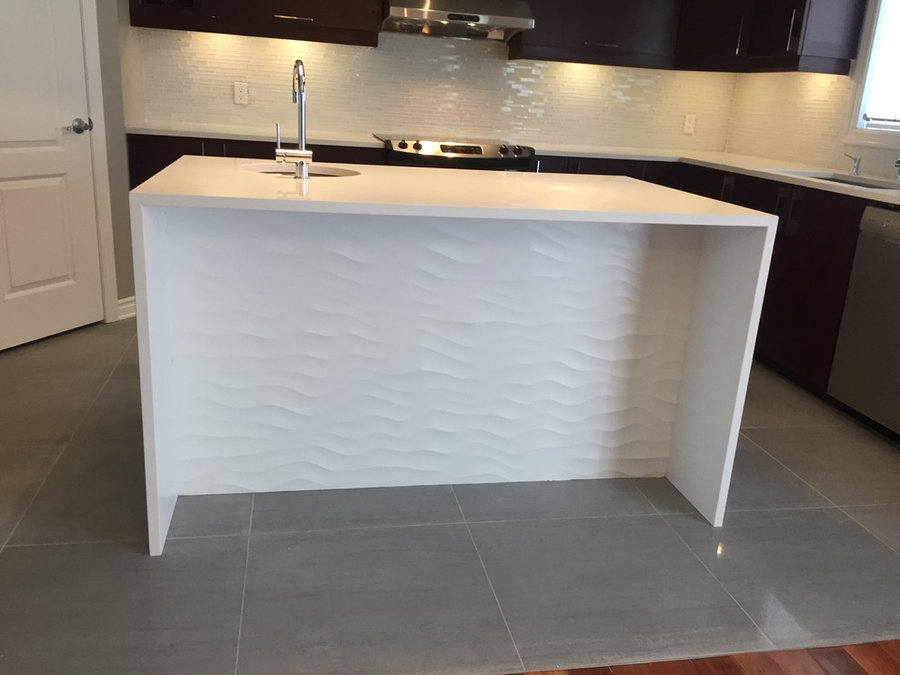 A modern kitchen with a white countertop island featuring a textured surface. The island is positioned in the center of the room, with a sink and faucet installed on the countertop. The kitchen has dark cabinets, a tiled backsplash, and a stainless steel refrigerator on the right side. The floor is tiled, and there is ... | Brossard Family Home - Renovation Project | 935e20a95325d2a54ed7110c32efe4845facb7e976d1d3dd75b9bd081274173c | 000910723365 | 0 | 0 | 62 | 6 | 0 | 0 | |