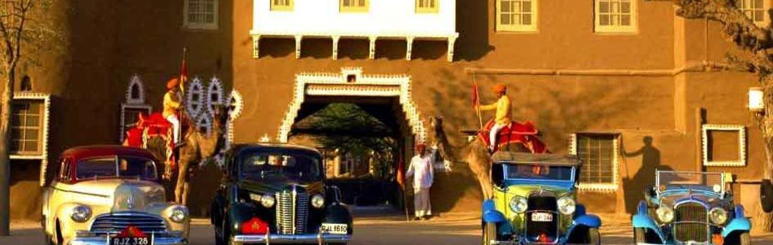A row of vintage cars parked in front of an old building with a large arched entrance. The building has a brown brick facade with a white trim around the windows and doors. There are flags and banners hanging from the building, and the scene has a warm, sepia-toned color palette. | Entrance to Desert Resort Mandawa | d56d0f420b32862a71148b61f82f2fd687c6ca9e07ebb46d898be31cf5f68c66 | 000910723219 | 0 | 0 | 51 | 5 | 0 | 0 | |