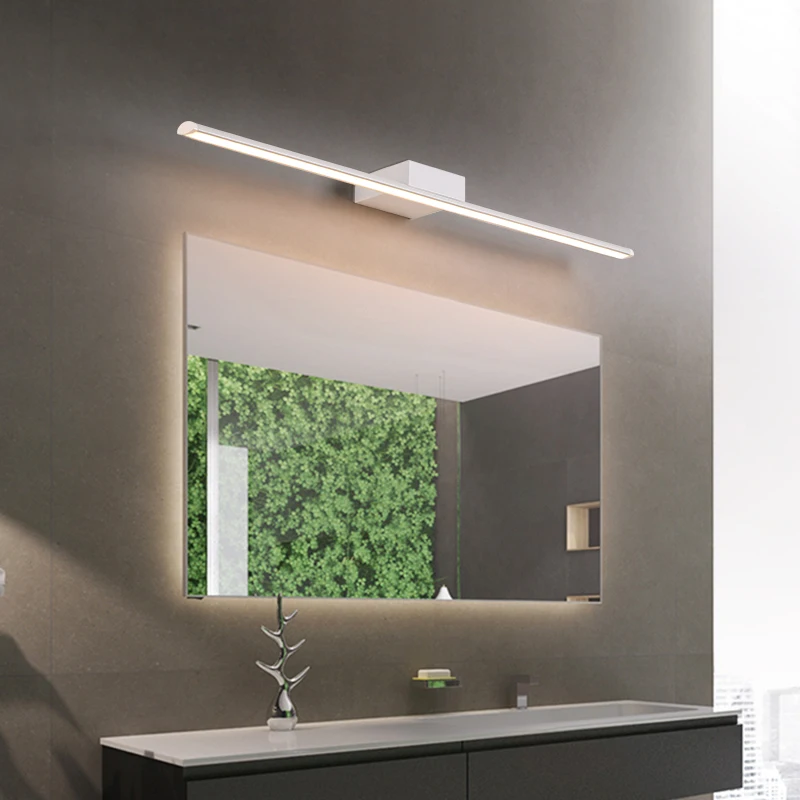 A modern bathroom with a large mirror above a sink. The mirror is framed by a thin, illuminated strip of light. The wall behind the mirror is dark, and there is a green, leafy plant visible through the mirror's reflection. The sink is black with a metallic faucet, and there is a small, metallic soap dispenser to the ri... | Modern minimalist aluminum LED lamp bedside lamp led wall lamp bathroom light mirror light AC110~260V Led Wall Light home deco modern bathroom led mirror light 520 80 75mm 90 260v 12w 4 heads aluminum acryl led wall sconce led bed lamp 100% quality guaran | e2658cf2753b848ec092d0e20dcab06def769725be931f4b7a40ce3092effcbb | 000910723574 | 0 | 0 | 83 | 44 | 0 | 0 | |