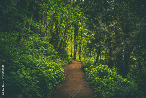 A lush green forest with a dirt path leading through it. The trees are dense with green foliage, and the forest floor is covered with greenery as well. The image has a natural, vibrant color palette with no visible water or reflections. | Route dans la for\xc3\xaat Path through vibrant lush green Pacific Northwest summer forest | 0c26049d9b9a28894d27331508f3397d964db4cb2020866e21de2ec0c4d1ab92 | 000910723798 | 0 | 0 | 42 | 13 | 0 | 0 | |