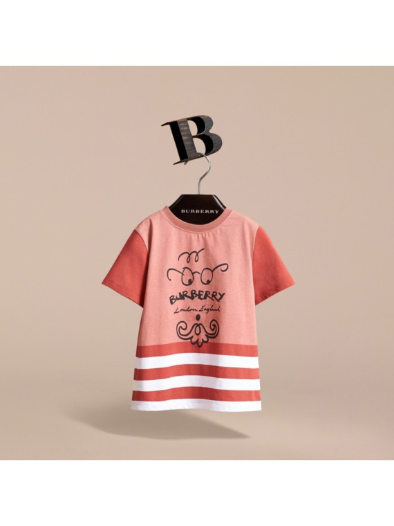 A pink and white striped shirt with a graphic design on the front is displayed on a hanger against a beige background. The shirt has a round neckline and short sleeves. The graphic design features a pair of glasses with a 'B' in the center, surrounded by decorative elements. Above the shirt, there is a metallic 'B' log... | Bearded Gent Print Striped Cotton T-shirt in Pale Cinnamon - Boy | Burberry United Kingdom - cell image 2 | c2d7f50e0f2a558aaf016af93297535283f0fa57c1987003c622c491ca09b4b9 | 000910723838 | 0 | 0 | 61 | 19 | 0 | 0 | |