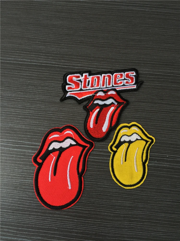 A black and red embroidered patch of a tongue and lips with the word 'STONES' above it is placed on a grey surface. The patch is surrounded by a yellow border with a red tongue and lips design. | Rolling Stone Tongue Embroidered iron-on Patch 3 1/2 | 4ce5088b87f358244bcf9ea0648a2263b535b2e902b2bf9c2a230703c83a4059 | 000910723931 | 0 | 0 | 38 | 8 | 0 | 0 | |
