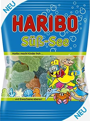 A bag of Haribo candies with a cartoon character on the front. The character is a yellow dog with a red collar and a blue hat, surrounded by various candies and sea creatures like fish, a starfish, and a seahorse. The bag is green with a red border and the words 'Haribo' and 'S\xc3\xbcss-See' written in red. There are ... | Haribo SUESS-SEE, 15er Pack (15 x 200 g) | 7017fce301a8b8cc4f6a82e499489542dafacb931814cd13dfa8fb1e2418f917 | 000910724071 | 0 | 0 | 78 | 8 | 0 | 0 | |