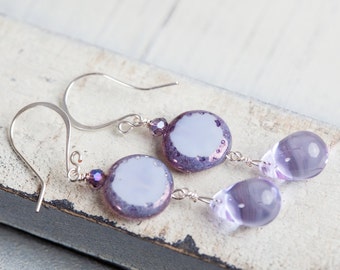 A pair of earrings with a purple gemstone and a clear gemstone, both with a textured surface, are displayed against a white background with a subtle grey tone. The earrings are connected by a silver chain and are positioned on a surface that has a soft shadow cast over it. | Lavender Drop Earrings, Purple, Drop Earrings, Lavender Earrings, Purple Earrings, Spring Earrings, Teardrop Earrings, Purple Teardrop, Gift | 403ea0d06e934fb998078217ede1dbbcc7ace2d1b86055b7224115500f1e1b6c | 000910724025 | 0 | 0 | 50 | 17 | 0 | 0 | |