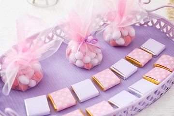 A tray of assorted candies is displayed on a table. The candies are arranged in rows, with each row containing a mix of pink and white candies, and a row of gold candies. The candies are tied with pink ribbons and placed on a purple tray with a white lattice design. The tray is set against a white background with a hin... | Tray with treats for baby shower party on table | f1ede53729a3e35b2fd2f96af0dac117e6b951a495c6af175dec9adf700d8727 | 000910724056 | 0 | 0 | 66 | 9 | 0 | 0 | |