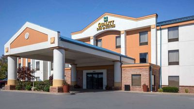 The first image shows the exterior of a hotel building with a prominent sign that reads 'Country Inn & Suites'. The building has a modern design with a combination of orange and white walls. There is a large overhang with a blue roof that extends over the entrance. The entrance is flanked by two columns with a decorative top. In front of the entrance, there are two large potted plants and a trash can. The parking lot is visible in the foreground, and the sky is clear and blue. | Quality Inn & Suites Arnold | d62be6c76191c269e45308f50861210922979b1991f8220af3c66dabc82f2f88 | 000910689144 | 0 | 0 | 89 | 5 | 0 | 0 | |