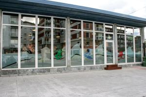 The first image shows a modern building with a large glass facade. The building appears to be a contemporary structure with a flat roof and a blue overhang. The glass windows reflect the surrounding environment, including a building with a red facade and a clear sky. The ground is paved with a light-colored material, and there is a wooden bench in front of the building. | Mundaka Hostel & Sports Cafe | cd4f0729cd1a3f6ae661de85daa2be3d1c72c9e7e553d6f892d1dd237b5acf89 | 000910689076 | 0 | 0 | 65 | 5 | 0 | 0 | |