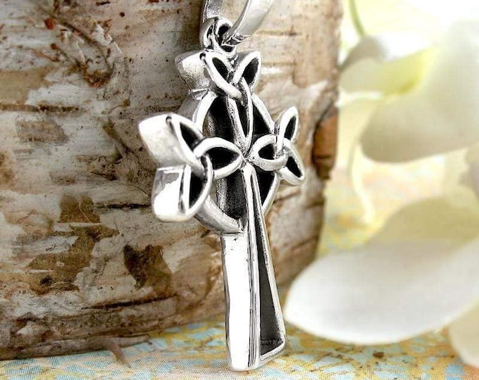 A silver cross pendant with a floral design is hanging from a chain, resting on a textured surface with a blurred background featuring white flowers. | Trinity Knot Celtic Cross, First Communion, Confirmation, Wedding Necklace, Irish Cross, Easter, Birthday, Ireland, Scotland | 751305c5b573025945b768247af780455c5568c4e26dbaccfb99bef7d6143163 | 000910689100 | 0 | 0 | 25 | 15 | 0 | 0 | |