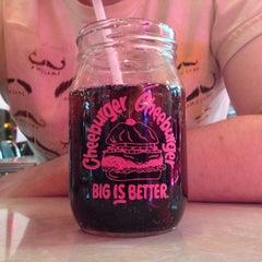 A close-up of a glass filled with a dark beverage, likely a soda, with a label that reads 'CHEESEBURGER BIG IS BETTER'. The glass is placed on a surface with a pinkish hue, and the background is blurred, focusing the viewer's attention on the glass and its contents. | Photo taken at Cheeburger Cheeburger by James S. on 4/17/2014 | 948b0940e1ab8bf3d49343f8abe5bee885b5dfd30a5a56846ff1e2e60428a268 | 000910689252 | 0 | 0 | 48 | 10 | 0 | 0 | |