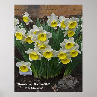 A vibrant painting of a bouquet of daffodils with yellow petals and green leaves, set against a brick wall background. The painting is signed by the artist, V. J. N. Artist, at the bottom. | &quot;Bunch of Daffodils&quot; Poster | 53d96bceca78f3bec0e191114ca9795c7b953965602526ca24808bba74ea73b4 | 000910689236 | 0 | 0 | 34 | 4 | 0 | 0 | |