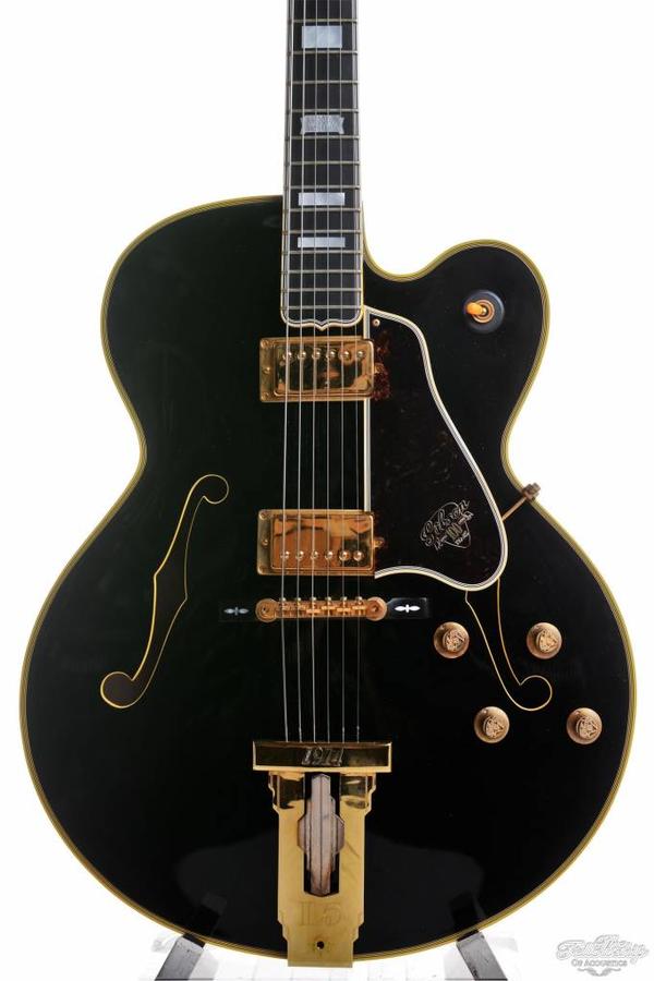 A close-up of a vintage electric guitar with a black body and gold accents. The guitar has six strings, a gold bridge, and a pickguard with a circular design. The headstock is ornate with a gold finish and a tuning peg. The guitar is positioned against a white background. | Gibson L5ces Centennial ebony 1994 Mint | fc7be8c2d95f0a01053c50612640eb927f7df765cfb323a2bc40c1ca22f4d92a | 000910689172 | 0 | 0 | 49 | 6 | 0 | 0 | |