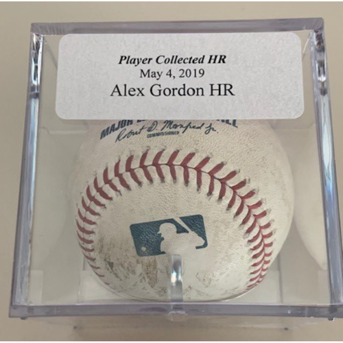 A baseball is displayed in a clear plastic case with a white background. The case has a label that reads 'PLAYER COLLECTED HR' with the date 'MAY 4, 2019' and the name 'ALEX GORDON HR'. The baseball has a visible logo of a baseball bat and a baseball glove on it. | Photo of Player Collected Baseball: Alex Gordon Home Run | 82e21ff695027c43e5e2adc49e413c60b8737ae1c1b6dc06556c573e9a0950b5 | 000910689164 | 0 | 0 | 51 | 9 | 0 | 0 | |