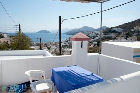 A small balcony with a white railing overlooks a picturesque Mediterranean village. The balcony features a blue tablecloth covering a table, a white chair, and a blue and white striped towel hanging over the railing. The village below is surrounded by a calm sea and a mountain in the distance. | Greek island house for rent - Leros | 36aea93aef0225c3fe5148b4598c6aa31d6dd3ed8001715ac7eaef21cb9899fa | 000910689378 | 0 | 0 | 50 | 7 | 0 | 0 | |
