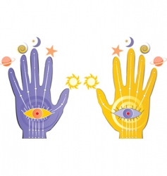 The second image shows two hands with a mystical theme. The left hand is purple and has a large eye with a yellow iris and a black pupil, surrounded by a circle with a star and a crescent moon above it. The right hand is yellow and has a large eye with a yellow iris and a black pupil, surrounded by a circle with a sun and a star above it. Both hands are positioned as if they are touching, with the eyes aligned. The background is white, and there are additional stars and moons scattered around the hands. | palms with psychic symbols vector image vector image | d87314d712c0326846d6954f6f91498e81aea44eb49567514b68123017753c2c | 000910689310 | 0 | 0 | 99 | 8 | 0 | 0 | |