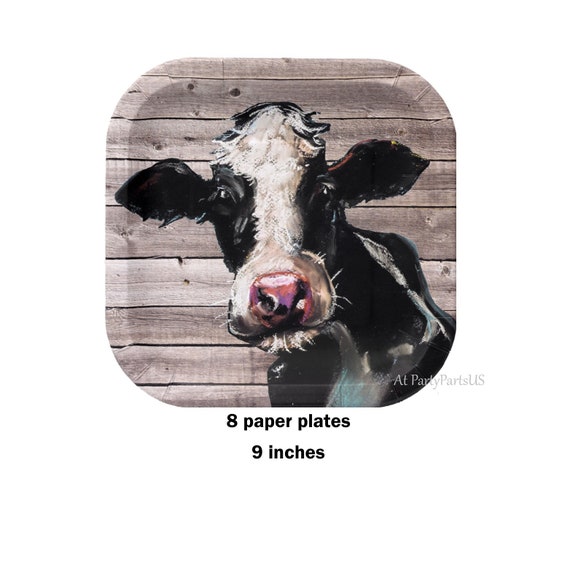 A stylized illustration of a cow with a white face and black body, standing in front of a wooden fence. The cow has a pink nose and is looking directly at the viewer. The image is presented as a circular sticker with a white border, featuring the text '8 PAPER PLATES 9 INCH' at the bottom. | cow plates rustic barn wood paper plates farm birthday barn wedding rural farm animals farmers beef dairy bovine agricultural from PartyPartsUS on ... sc 1 st Etsy Studio : rustic paper plates - pezcame.com | b113bc71dcf8929358d00f4b37d9432b0601e685fd07f0308b67a618609695d4 | 000910689074 | 0 | 0 | 56 | 34 | 0 | 0 | |