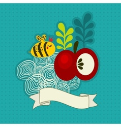 A whimsical illustration featuring a large red apple with a green leaf on top, a smaller red apple with a green leaf, and a yellow and black striped bee flying above. The scene is set against a teal background with a white ribbon-like element at the bottom. The illustration has a playful, almost three-dimensional appearance with a textured background. | Bee and apple vector image | 8fdb6b8f0b9551bd845a94b712c9f8b6baf4bc386e4e5ff58266932a37502f3c | 000910689801 | 0 | 0 | 59 | 5 | 0 | 0 | |
