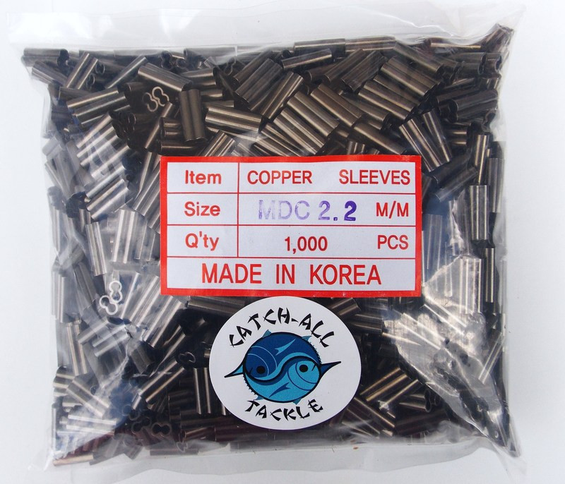 A bag of copper-colored metal fasteners is displayed against a white background. The fasteners are of various sizes and are densely packed within the bag. A label on the bag reads 'Copper Sleeves' with the size 'MDC 2.2' and 'Made in Korea'. Below this, there is a 'Made in Korea' label with the size '1000 pcs'. The bag is sealed with a plastic ziplock. | 100pcs//bag Aluminum fishing line Crimp sleeve copper tube 1.0mm-2.0mm DHC | 1f87b622b46b6a2c590a47230d172a1c5d21c15146d7f3ab22cd6e858f9ab455 | 000910689651 | 0 | 0 | 64 | 10 | 0 | 0 | |