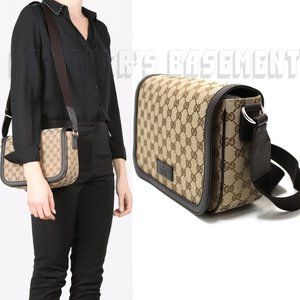 A woman is standing with her back to the camera, wearing a black shirt and black pants. She has a black shoulder bag with a brown pattern on her left shoulder and a brown and black patterned shoulder bag on her right shoulder. In front of her is a large brown and black patterned shoulder bag. | GUCCI brown Original GG Canvas & Leather crossbody flap Shoulder Messenger Bag | 7977f8008d218b4fd971e7daf60204af603eba0f8248756d12b32779da21c54e | 000910689720 | 0 | 0 | 56 | 12 | 0 | 0 | |