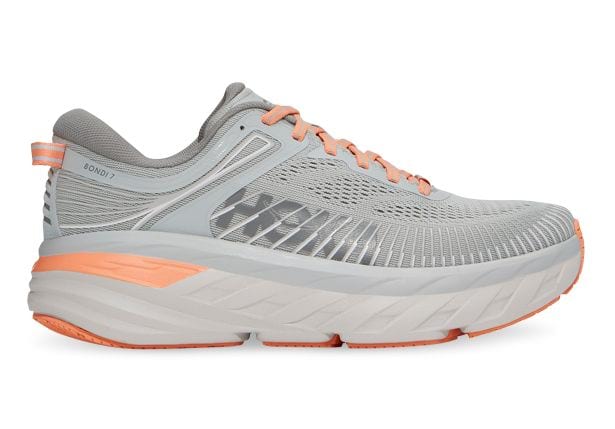 A pair of grey and orange running shoes with a mesh upper and a white sole. The shoes have a lace-up front, a heel counter, and a midsole with a visible brand logo. The shoes are placed against a white background with a plain surface. | Hoka Bondi 7 Women's | 68f6e38104ffbd17a597f228772f1c3013a926e9022efb3be56149995ba3688f | 000910689588 | 0 | 0 | 45 | 4 | 0 | 0 | |