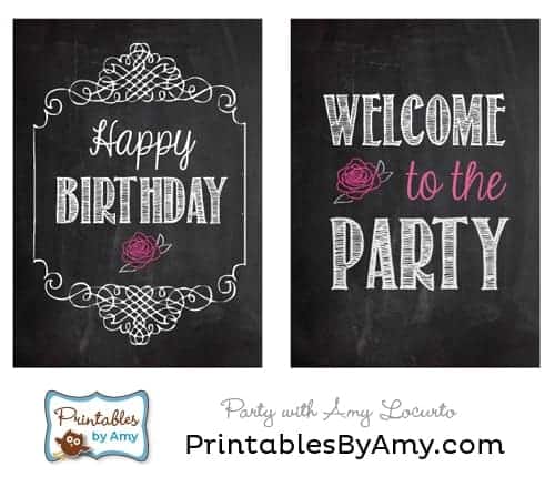 The first image shows a chalkboard-style design with the phrase 'Happy Birthday' at the top, followed by 'Welcome to the Party' at the bottom. The design includes a pink rose in the center and decorative elements such as swirls and a heart. The image is part of a larger composition that includes a logo and text at the bottom, indicating it is a printable design available on the website 'PrintablesByAmy.com'. | Chalkboard Rose Birthday Party Printable Signs by Amy Locurto. LivingLocurto.com | 7b808fd8183d2f02ddd8af5e7ab0f5e5f9d18a11949c0df1fd1670d76f190b02 | 000910690587 | 0 | 0 | 70 | 10 | 0 | 0 | |