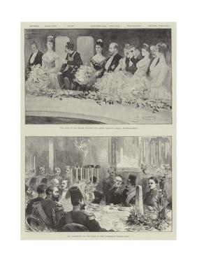 A black and white illustration of a formal dinner scene with multiple guests seated around a long table. The table is adorned with a floral centerpiece and lit candles. The guests are dressed in formal attire, with men wearing suits and women in gowns. The room has a grand atmosphere with a chandelier hanging from the ceiling. The illustration is detailed, showing the guests engaged in conversation and the intricate details of the table setting. | The Visit of the Shah by Gabriel Nicolet | b20e5af0b207df2cc0c885e6ccd489afe24f8a6edb41551fc329edbb0a9b2128 | 000910690549 | 0 | 0 | 75 | 8 | 0 | 0 | |