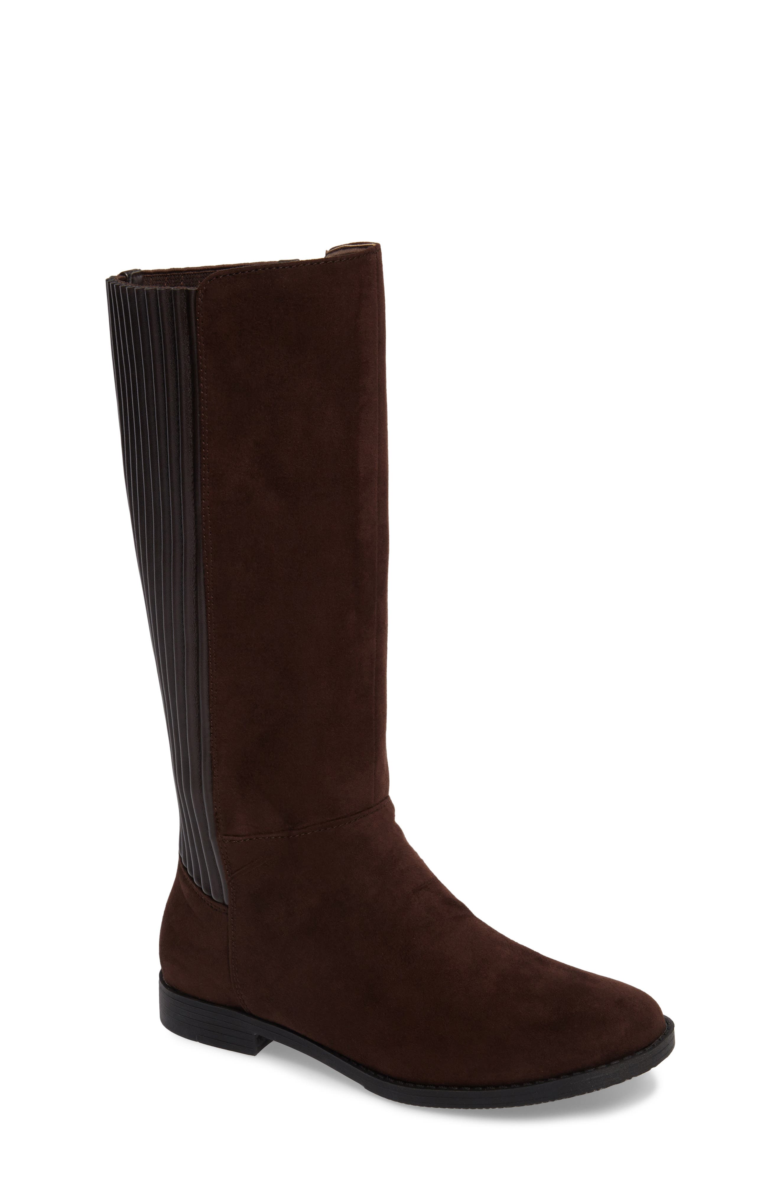 A pair of brown leather boots with a ribbed texture and a black sole. The boots have a tall shaft that reaches up to the calf and a pointed toe. They are displayed against a white background. | Kennedy Pleated Riding Boot,\n Main thumbnail 2, color,\n | 6e148b9e8d8a6393bb426dda0132b6754872c1eb7d930edd3ddfb99358d55216 | 000910690642 | 0 | 0 | 37 | 8 | 0 | 0 | |