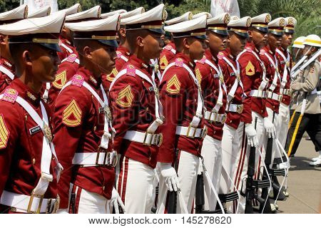 A group of soldiers in red uniforms with white hats and black boots are standing in a line. They are wearing white gloves and have various insignia on their uniforms. The soldiers are standing on a paved surface, and there is a person in a beige uniform and a white hat standing to the right of the line. | Jakarta, Indonesia - August 17, 2016: Indonesian police cadets marching with rifle in independence day flag ceremonial at Indonesian Presidential Palace. | a4df9e38e210f793a9f255cc57187e8593c47b5010903fe9b8c41b18e7d6c286 | 000910690514 | 0 | 0 | 58 | 21 | 0 | 0 | |