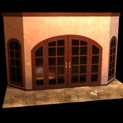 The second image shows the same 3D-rendered scene of the arched doorway with the wooden frame and glass panels. However, the lighting has been altered to create a more dramatic effect. The doorway now casts a strong shadow on the floor, and the interior of the doorway is illuminated with a warm, golden light, contrasting with the cooler tones of the exterior. The floor appears to be reflecting this light, enhancing the depth and realism of the scene. | french door 3d model | 9d695440235f7313817603d37edf2e1aec4ac9ca76de142678ac71ed56a1cdc7 | 000910690744 | 0 | 0 | 78 | 4 | 0 | 0 | |