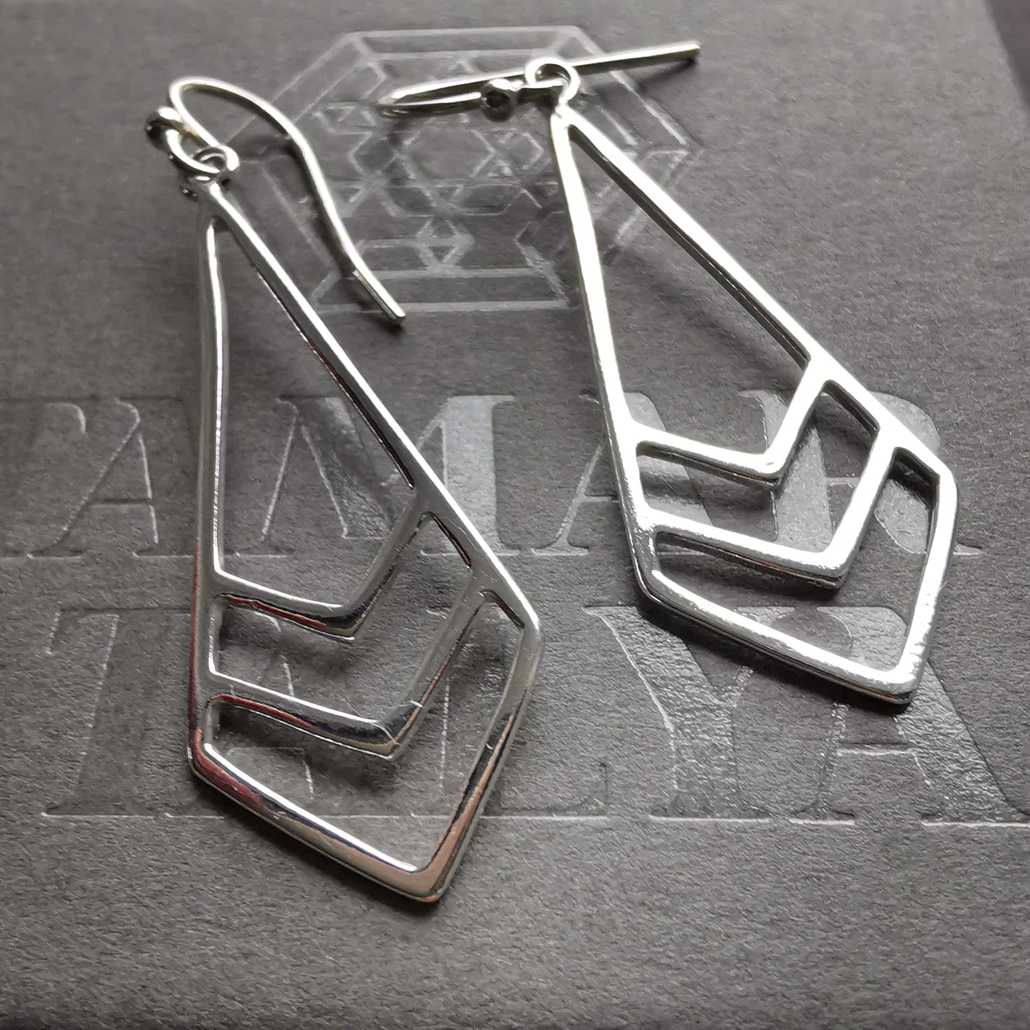 A pair of silver earrings with a geometric design is displayed on a grey background. The earrings have a unique shape with a combination of straight and curved lines, and they are connected by a small circular element. The background features a logo or text that reads 'TAMARA' in a stylized font. | Chevron drop earrings in sterling silver gift ready for her | 885fd247b0b43ac697ce079ed2e2d0419feb78f0326d7f811218acb900fc45d7 | 000910685453 | 0 | 0 | 52 | 10 | 0 | 0 | |