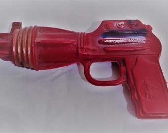 A red toy gun with a metallic finish and a black grip is lying on a white surface. The gun has a trigger, a magazine, and a barrel with a metallic tip. There are visible scratches and wear on the surface of the gun, and it appears to be made of plastic. | Ray Gun Squit Gun | cb2f0a815685f649d644a10d43852bcae6be8c03ca121be147464db43fe6412b | 000910685385 | 0 | 0 | 52 | 4 | 0 | 0 | |