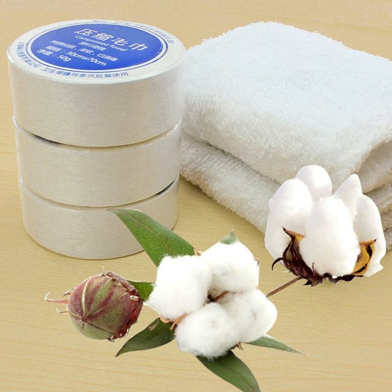 A small potted plant with white flowers is placed on a wooden surface next to a stack of three round, silver containers with blue labels. | Compressed Towel Magic Outdoor Travel Wipe 30*70CM Soft Cotton Expandable Just Add Water Towels Space Saving Portable Towels Cotton Hotels Camping Trip Practical Easy Carry Portable Towels | f021579d551c1a2751ab93635c97c3867b5a804630c3ce1292c4c332f4c244c5 | 000910685499 | 0 | 0 | 25 | 27 | 0 | 0 | |