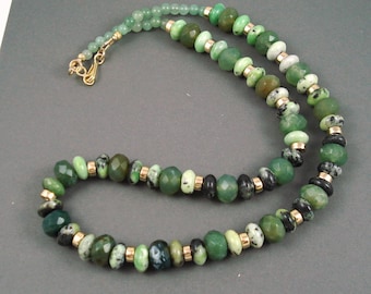 A close-up of a green gemstone necklace with a clasp, featuring a variety of green gemstones in different shades and textures, some with gold accents. The necklace is draped over a dark surface, and the focus is on the gemstones and the clasp. | Chrysoprase and Green Agate Necklace, 19 Inch Strand of Green Speckled Chrysoprase and Solid Green Agate | 1c413ebc67ea790fe6f96c73e78e89733e70f1ac6b478988d5d2d0f0bd46d16f | 000910691517 | 0 | 0 | 43 | 16 | 0 | 0 | |