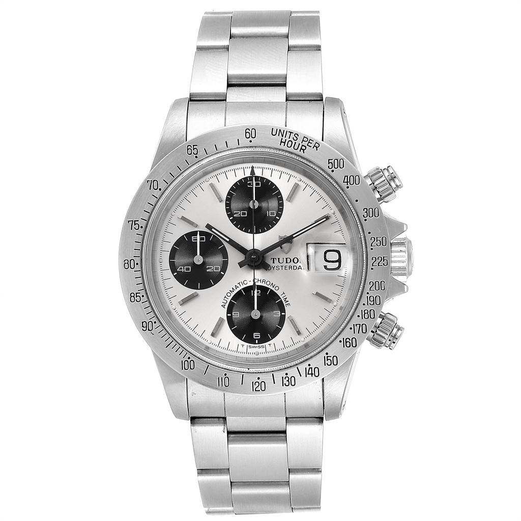 A silver wristwatch with a white dial, black hour markers, and a date display at the 3 o'clock position. The watch has a stainless steel bracelet and a screw-down crown. The watch face shows the time as 10:10. | Tudor Prince Big Block Oysterdate Silver Vertical Panda Dial Watch 79180 SwissWatchExpo | 2da725fcb11efdd4f1abe8f0b409cff2f20aa40f2baad575cff1e97c0c5a40ff | 000910691669 | 0 | 0 | 38 | 12 | 0 | 0 | |