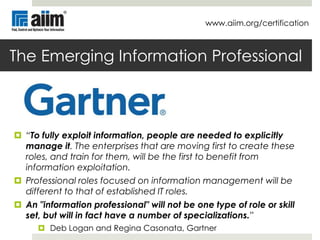 The image features a certificate with the title 'The Emerging Information Professional' and the name 'Gartner' prominently displayed. Below the title, there is a quote that reads, 'To fully exploit information, people are needed to explicity manage it. The enterprises that are moving first to create these roles, and train for them, will be the first to benefit from information exploitation.' The quote is attributed to 'Deb Logan and Regina Casonato, Gartner'. The certificate is adorned with the logo of 'AIlM' and the words 'Certification' and 'www.ailm.org'. | New Information Certification Slide 8 | aeb35d87ed19556d26c7bd21f004e2c81d60c8c6f68e226dd1de927628d2dc98 | 000910691709 | 0 | 0 | 87 | 5 | 0 | 0 | |