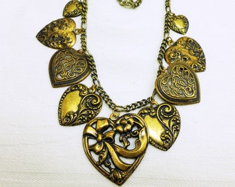 A close-up view of a gold necklace with intricate designs and heart-shaped pendants. The necklace is displayed against a white background, highlighting the detailed craftsmanship and the warm, shiny gold color. | Hearts Necklace Charms Gold Victorian Style Flirty Gift Her | d7ecb4f47675ef7f9c3532acae6e92a25ee02b0cccd31b6169eac61474693bd5 | 000910691587 | 0 | 0 | 31 | 9 | 0 | 0 | |