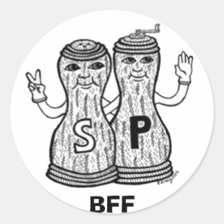 A cartoon illustration of two salt shakers with faces, standing side by side. The salt shaker on the left has a peace sign on its hand, and the one on the right has a peace sign on its hand as well. Both salt shakers have a smiling face with eyes and a mouth. The salt shaker on the left has the letter 'S' on its body, and the one on the right has the letter 'P'. The word 'BFF' is written below the salt shakers. | BFF Stickers | a38cb4384e8d6ce322732119fa10f2ce4853e56d95cbb94d3f9487e6bd38a5e0 | 000910691908 | 0 | 0 | 85 | 2 | 0 | 0 | |