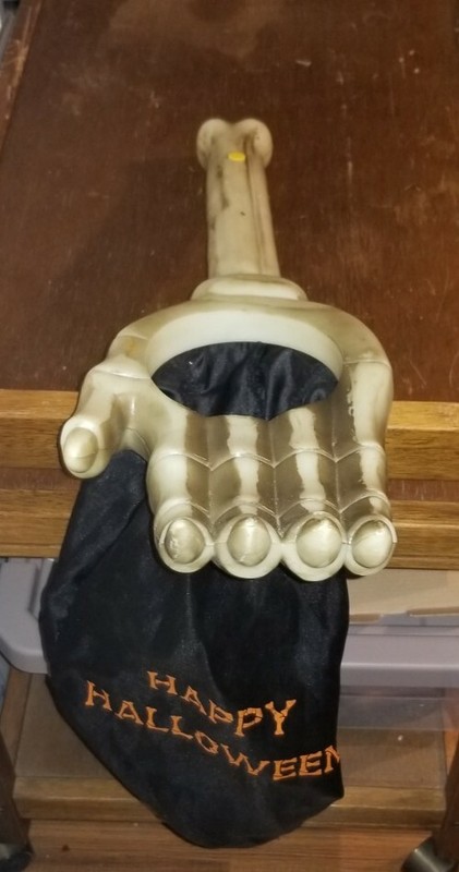 A Halloween-themed bag with a skeleton hand design is hanging on a wooden table. The bag has a black color with orange lettering that reads 'Happy Halloween'. The skeleton hand is positioned as if it is holding the bag, and the table appears to be old and worn. | Gemmy Halloween Trick or Treat Talking Skeleton Hand Candy Bag Sack 22" Arm Vtg | ff60a67347ad408bc1b650a909415e282bd095a5cddf66f8b917fa9750c00eb0 | 000910692061 | 0 | 0 | 48 | 14 | 0 | 0 | |