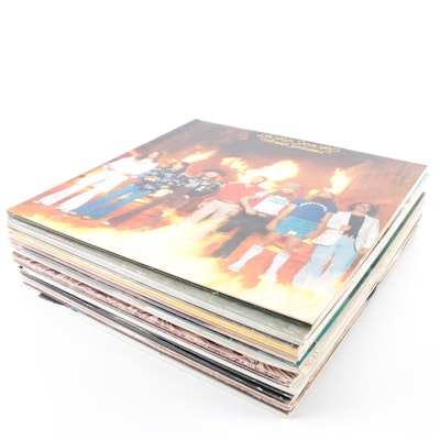 A stack of vinyl records with a large album cover on top, featuring a group of people with a fire in the background. The records are arranged in a gradient of colors, starting with a light brown at the bottom, transitioning to yellow, green, blue, and finally a dark brown at the top. The album cover is centered on the stack, and the records are neatly aligned. | Southern Rock LPs Including "Street Survivors" by Lynyrd Skynyrd | 2f4c1c3ca4a617ac6fe9360bffa649b1a510a714573316011e1e20225b93fdff | 000910692486 | 0 | 0 | 67 | 9 | 0 | 0 | |