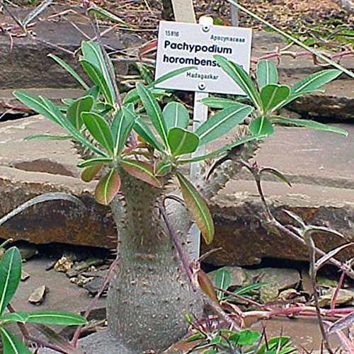 A small, spiky plant with green leaves is growing in a rocky area. The plant has a unique, bushy appearance with multiple branches. A sign next to the plant reads 'PACHYPHYTUM HORRIBENS' in a foreign script. The ground is covered with small rocks and pebbles, and there are a few other plants in the background. | Pachypodium horombense seeds - 20 seeds CactusPlaza.com | 202d63b289737c06a6b62da0ffb4459b88b021f8e2b3131175944bce4af8aaa4 | 000910692481 | 0 | 0 | 55 | 7 | 0 | 0 | |