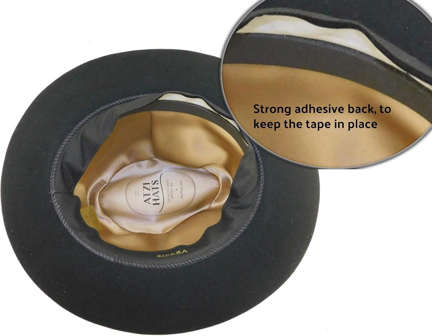 A black fedora hat with a gold interior lining is shown from the inside out. The hat has a ribbon band around the crown and a gold label on the inside. The interior lining is gold with a black border, and there is a small piece of tape on the lining. A magnified inset shows the text 'Strong adhesive back to keep the tape in place' on the lining. | Hat Tape Roll Hats Size Reducer Foam Sizing Tape Self Adhesive Strip Insert for Fedora Baseball Caps Panama Hats | c3083985c3245f252b248ec699e859587c51e8dce053e60bd434fa4632c3795f | 000910692400 | 0 | 0 | 69 | 19 | 0 | 0 | |
