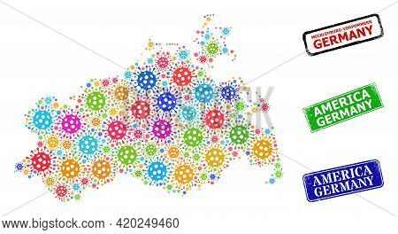 A stylized map of Germany with a colorful, abstract pattern overlaying the country's outline. The map is surrounded by three rectangular labels, each with a different country name: 'GERMANY' at the top, 'AMERICA' on the right, and 'GERMANY' at the bottom. The labels are in a bold, sans-serif font. The image also includes a watermark with the text 'BIGSOCKS.COM' and a numerical code '0420023100' in the bottom left corner. | Vector Covid-2019 Collage Mecklenburg-vorpommern Land Map, And Grunge America Germany Stamps. Vector | 135b88a545b4d6c0b562d8e47fd4432645470035aba0924558bbb5e0387d0f4c | 000910692395 | 0 | 0 | 69 | 12 | 0 | 0 | |