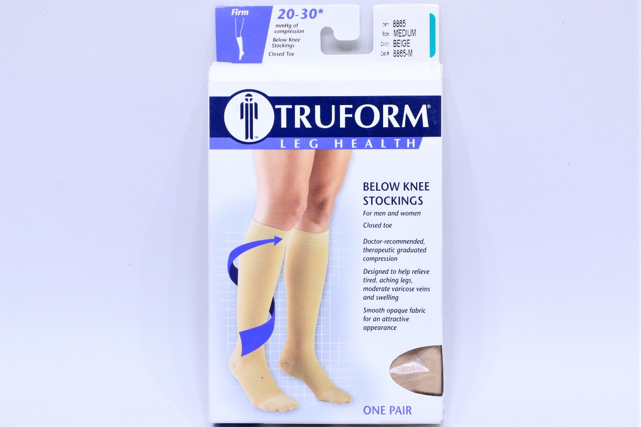 A package of Truform leg health stockings is displayed against a white background. The package features a blue and white design with the brand name 'Truform' prominently displayed. The stockings are designed to provide compression and support for the legs, with a gradient of blue and beige colors. The packaging includes instructions and product information, and the stockings are shown in a relaxed state with one leg bent at the knee. | 1b8e8e7f925 TRUFORM 20-30 mmHg BELOW KNEE STOCKINGS M MEDIUM 8865-M BEIGE | 4349cd43588f1c0b842e995710ead89141cd69c0cbb1373c5aaf8589b080b9f1 | 000910692701 | 0 | 0 | 71 | 11 | 0 | 0 | |