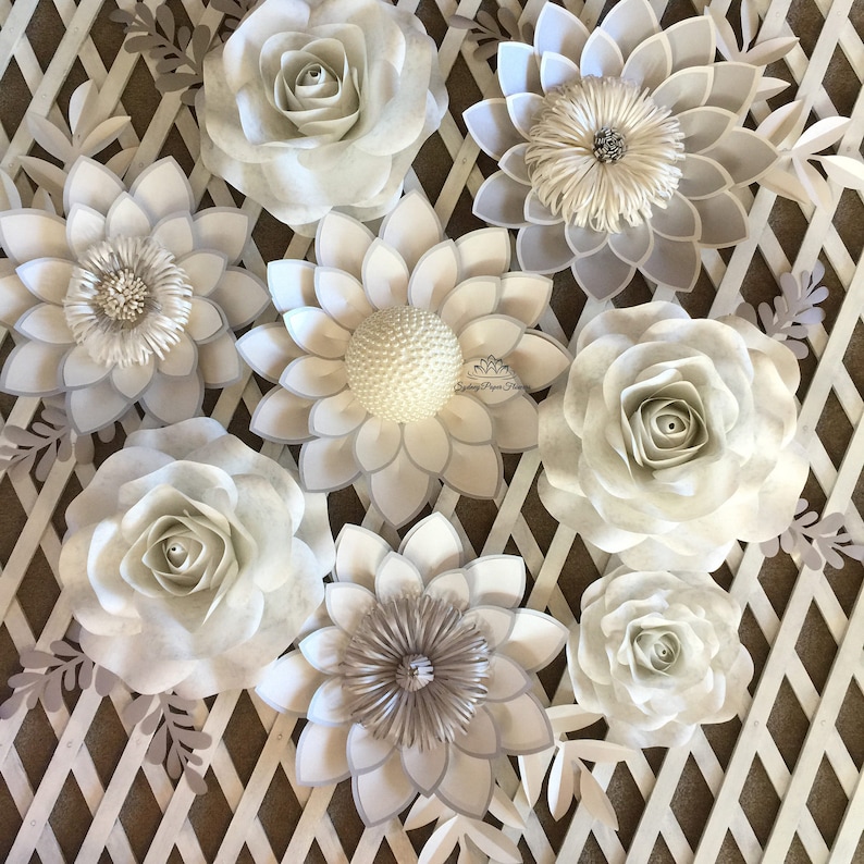 A collection of white ceramic flowers with intricate details, arranged on a textured surface. The flowers vary in size and shape, with some resembling roses and others resembling daisies. The arrangement is symmetrical, with a central white flower surrounded by smaller ones. The background is a textured beige surface with a grid pattern. | ROSE&LOTUS Paper flower backdrop/Paper flower wall/Wedding image 0 | 468e06a16a3821666ad4684557ce7d1be536daca23c60332e97527f315758761 | 000910692576 | 0 | 0 | 53 | 8 | 0 | 0 | |