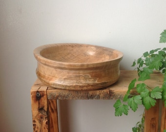 A wooden bowl with a textured surface and a visible grain pattern is placed on a wooden shelf. The shelf is supported by a wooden frame and is situated against a plain white wall. To the right of the bowl, there is a potted plant with green leaves, some of which are hanging over the edge of the shelf. | Curly maple bowl | 326f7edf5e12174eb8078005fa17e1e6458ea95b81d9edfb24dcbff71e2d4f79 | 000910692647 | 0 | 0 | 59 | 3 | 0 | 0 | |