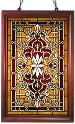 A stained glass window design featuring a central floral motif surrounded by intricate geometric patterns. The design is set within a dark brown frame, and the glass has a warm, golden hue with red and white accents. The window is suspended by a metal chain from the top, and the overall image has a vintage, artistic feel. | Tiffany-style classic Window Panel | 3bab1b3591e3680cf512159702cc43f09e5be5d43b2220cbb997f8b27caf26e3 | 000910692724 | 0 | 0 | 57 | 4 | 0 | 0 | |