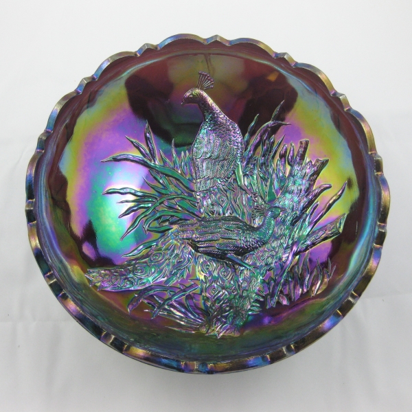 A purple glass plate with a colorful, iridescent finish and a detailed, embossed design of a bird in flight, surrounded by foliage, is displayed on a white background. | LG Wright Amethyst Peacocks with Butterfly back Carnival Glass Bowl | 26a93669acdccefecb3b55f5c7cea355edcbb0629c4689703c505e24276321ac | 000910692675 | 0 | 0 | 28 | 10 | 0 | 0 | |